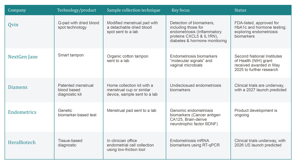 Figure 2: Analysis of start-ups (Qvin, NextGen Jane, Diamens, Endometrics and HeraBiotech) focused on menstrual blood samples for endometriosis diagnosis.