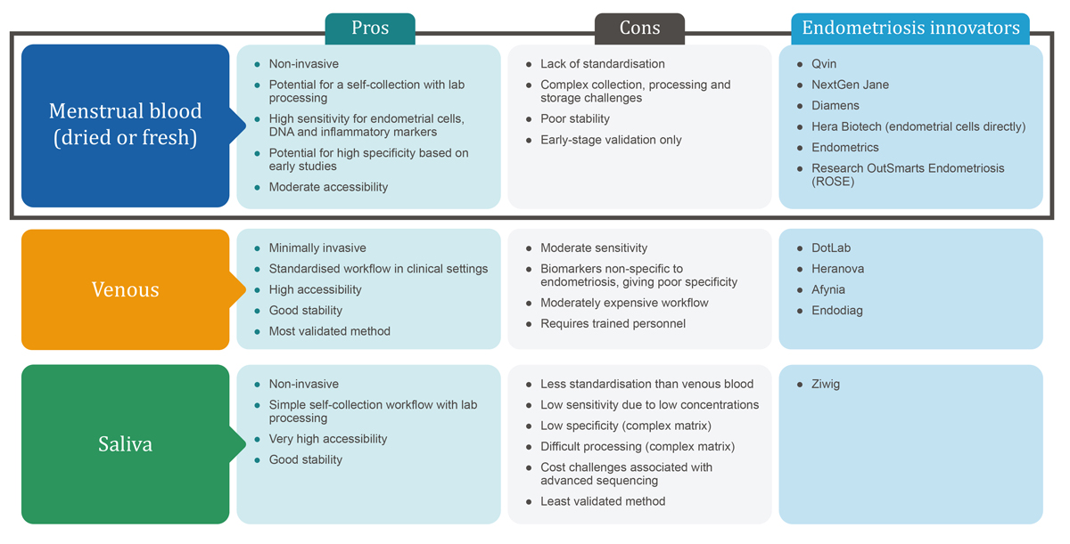 The below chart summarises pros and cons of venous blood, saliva, and menstrual blood in endometriosis diagnostics, as well as start-ups and research groups focusing on the use of these sample types. Urine has also been explored as a non-invasive specimen, but current evidence of diagnostic performance for endometriosis is limited.